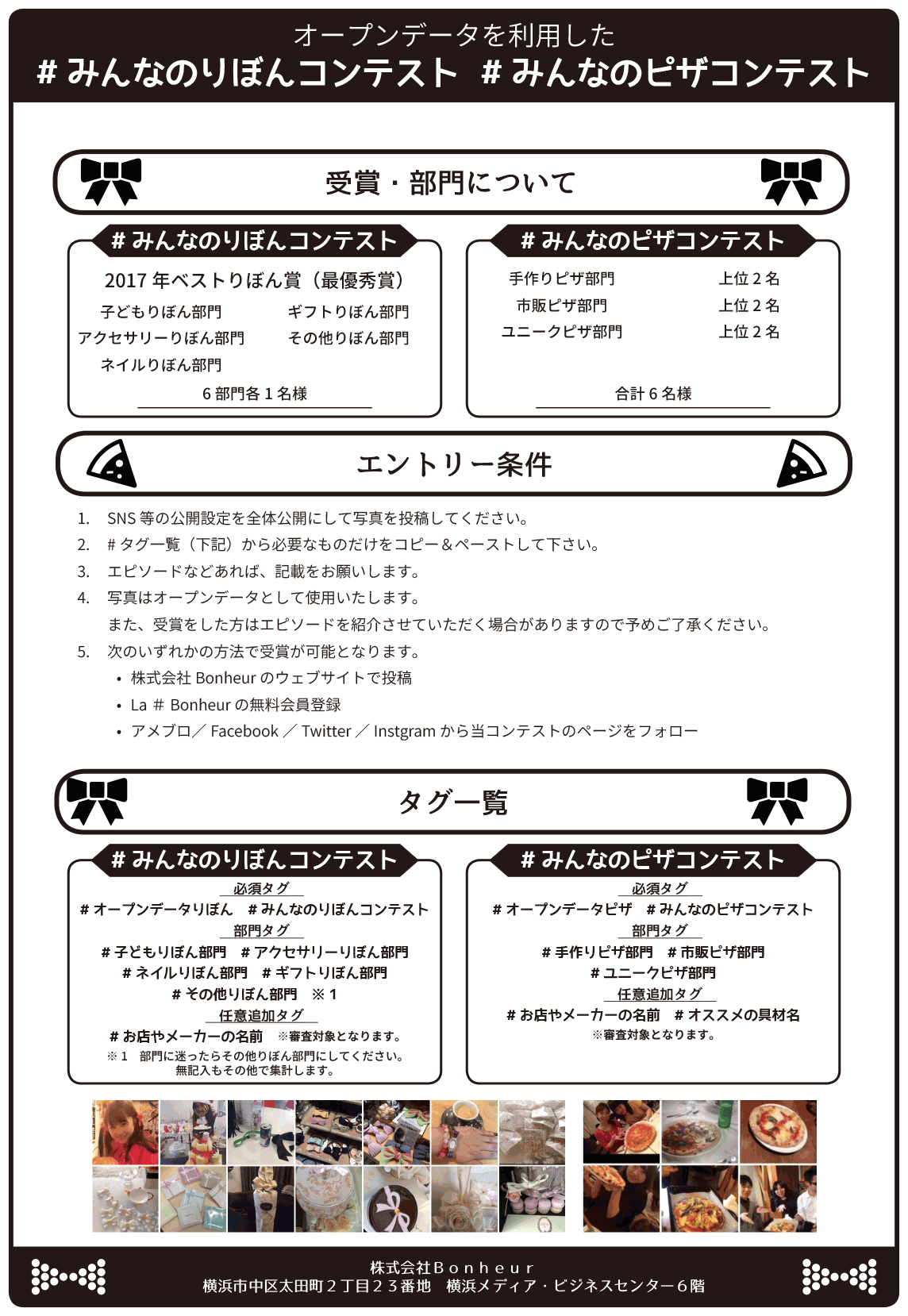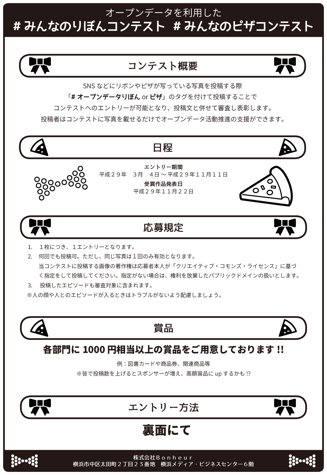 オープンデータ推進を国民参加で盛り上げるためのコンテストです。SNSなどにリボンやピザが写っている写真を投稿する際「#オープンデータりぼんorピザ」のタグを付けて投稿することでコンテストへのエントリーが可能となります。
